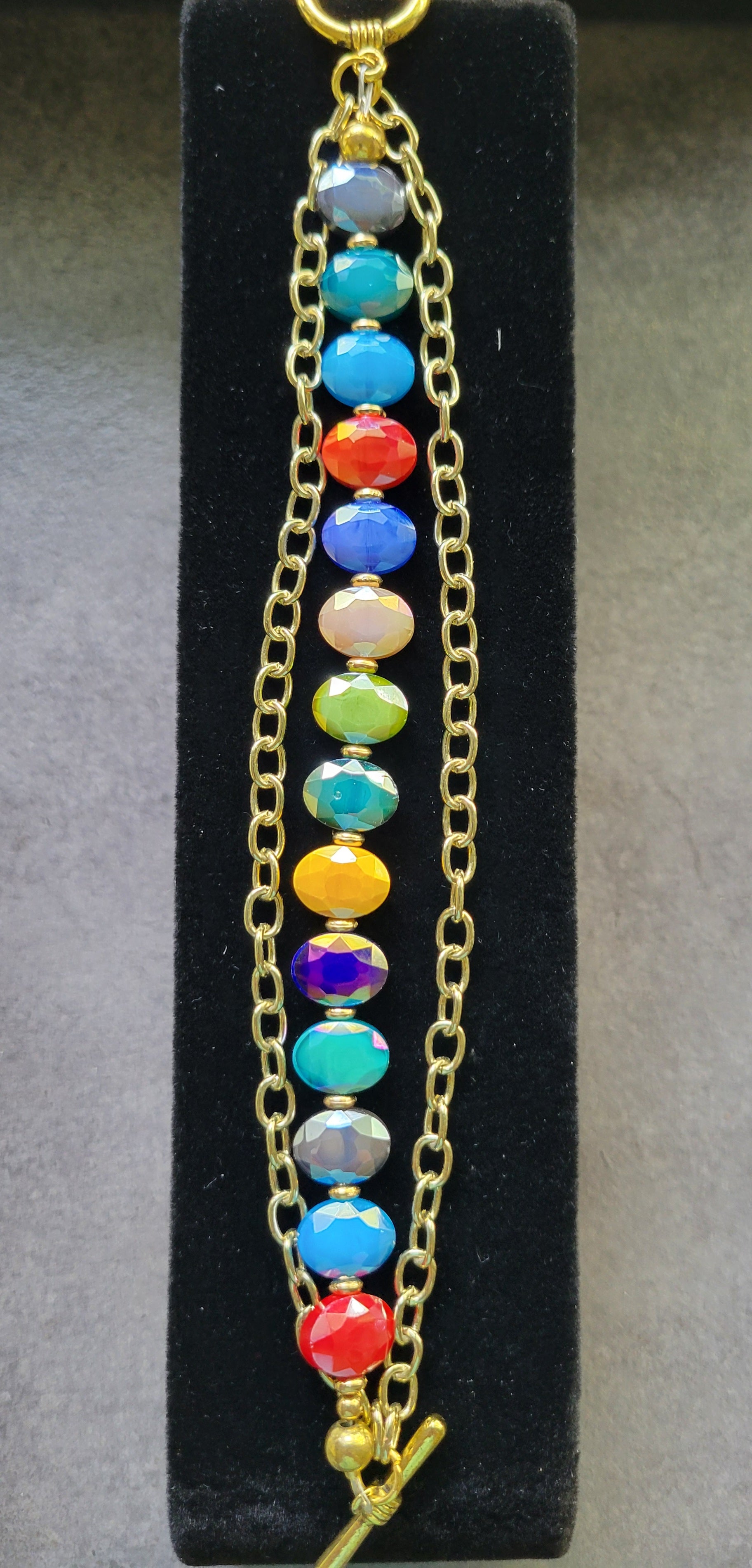3-Strand Multi-color Bracelet w/Gold chains, Toggle Bracelet- Approx. 7 1/2"