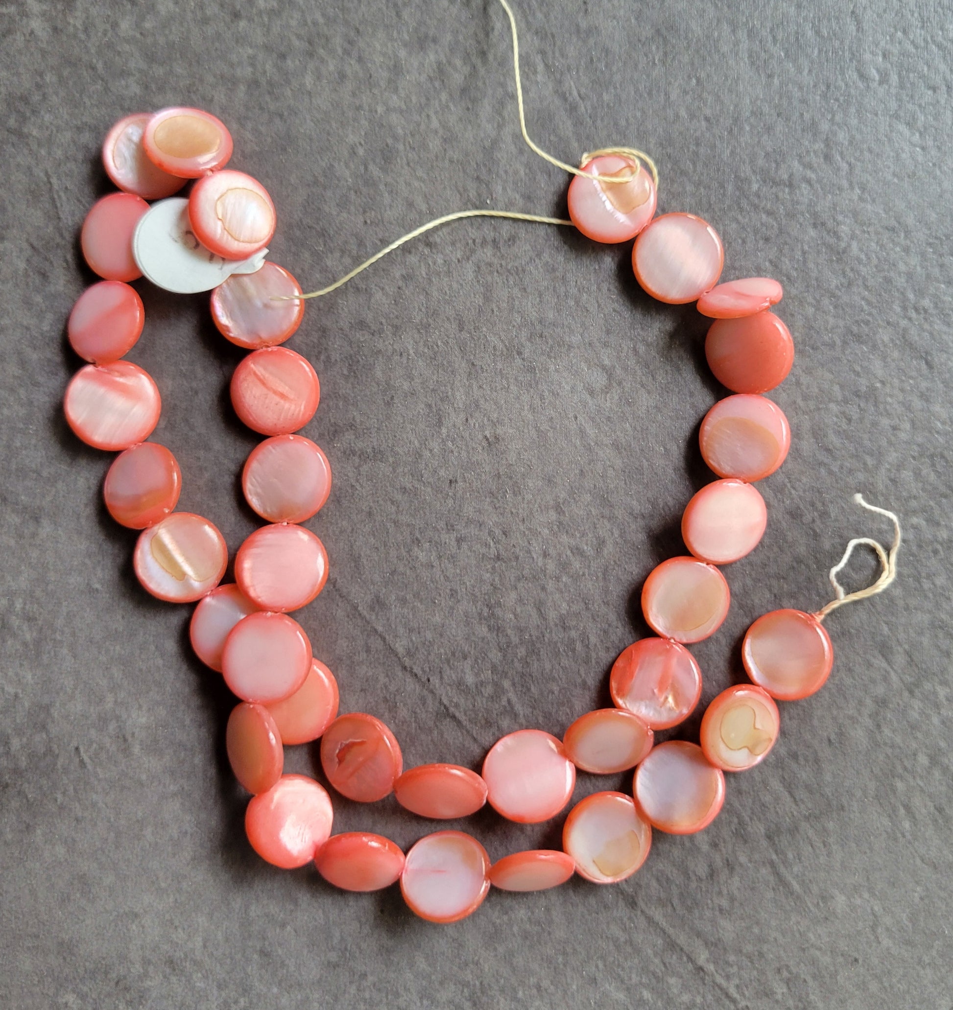 Dark coral mother-of-pearl shell (dyed), approximately 11-12 mm diameter, 3-4 mm thickness, approximately 15 1/4" strand, with approximately 35 beads.