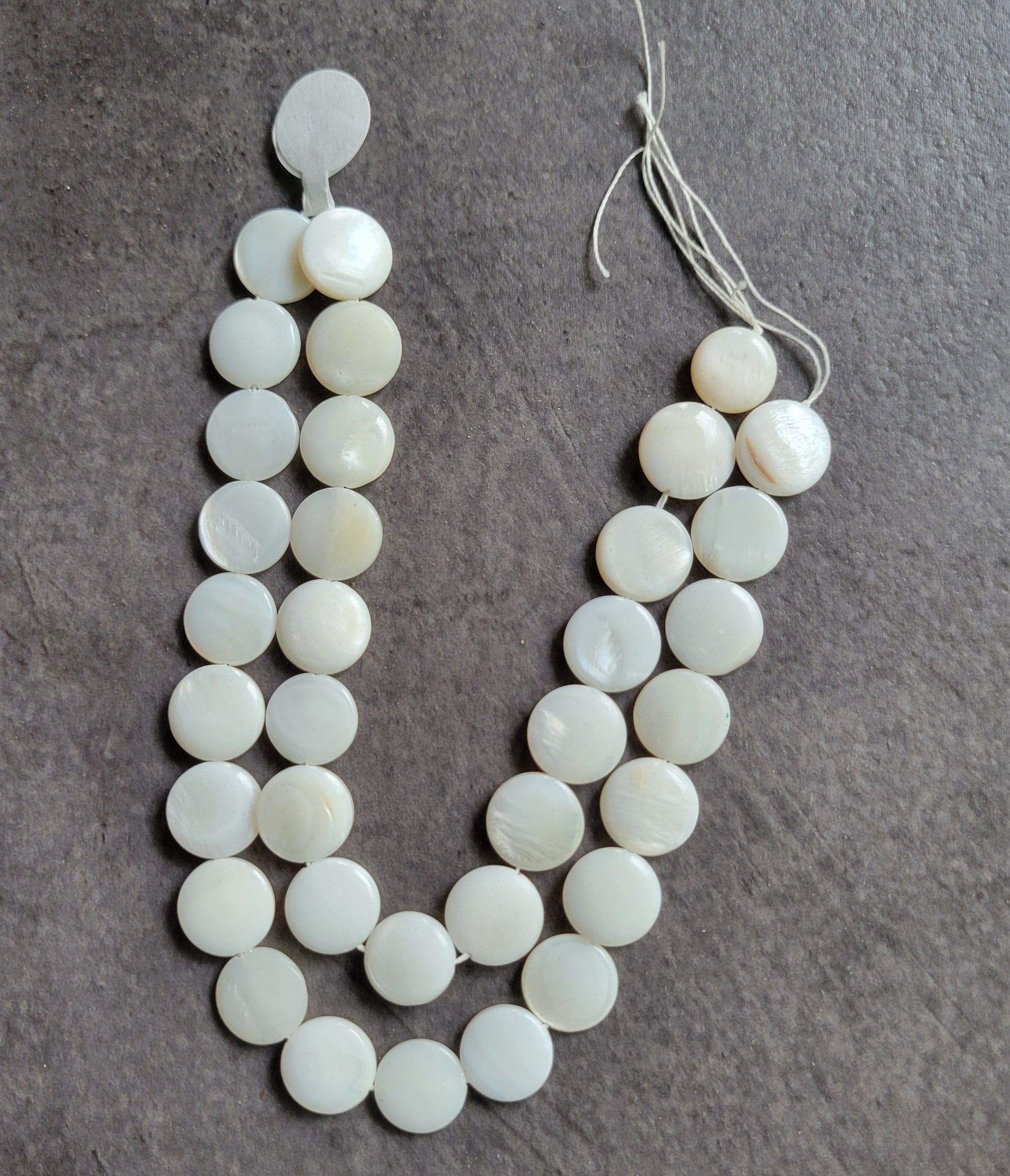 White mother-of-pearl shell, approximately 11-12 mm diameter, 3-4 mm thickness, approximately 15" strand, with 34 beads.